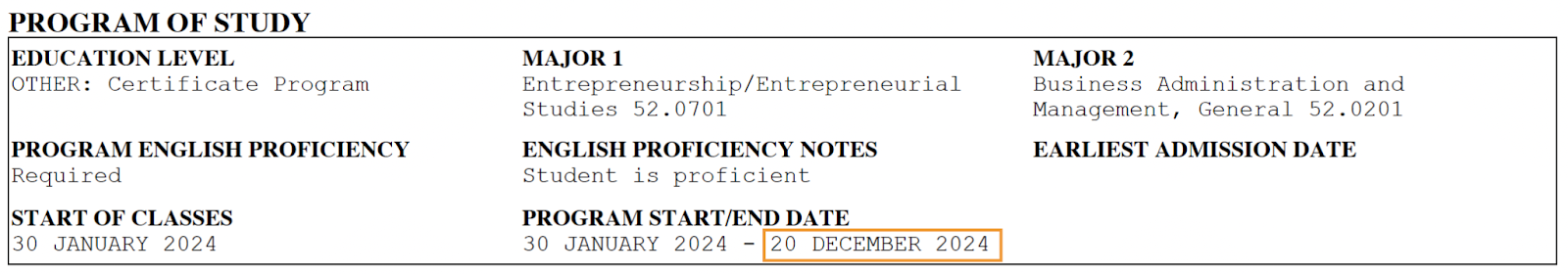 The grace period is counted from the program end date on your I-20 or DS-2019. In the example below, this F-1 student's program end date is December 20, 2024, which means they must depart the U.S. no later than February 18, 2025. Students should make arrangements to leave the country on time. An overstay can negatively affect your chances of obtaining another U.S. visa in the future.