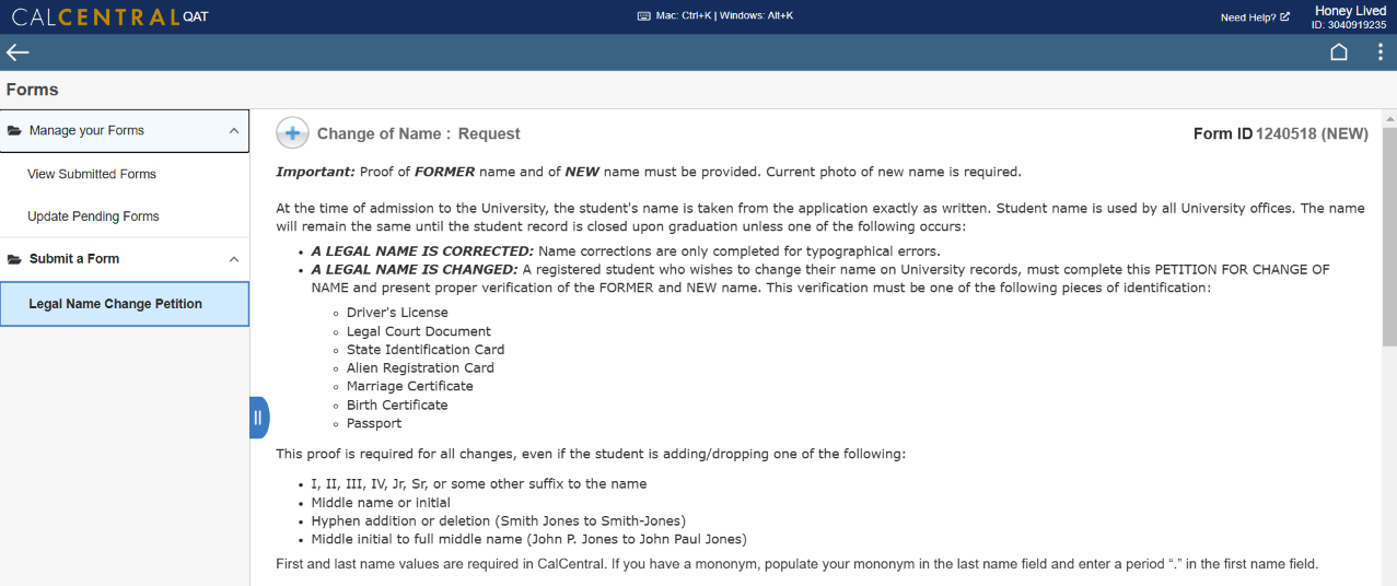 The Forms tile is where students can submit a Legal Name Change Petition. Other forms available to your specific student status should also be available on this page.